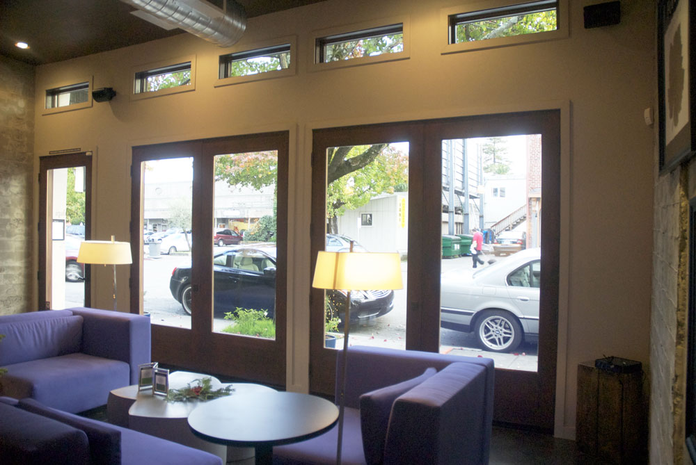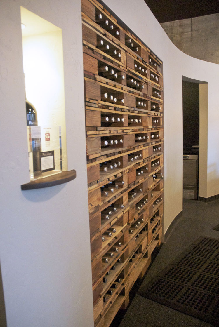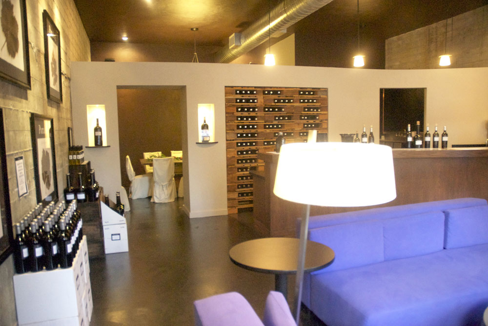 Our team gutted this space and started fresh, installing bifold atrium doors for an abundance of light. Custom tasting room counter tops, a wine pallet bottle storange shelf, and pops of luscious purple gives the space a truly unique and modern feel. Color design by Maria Flores.