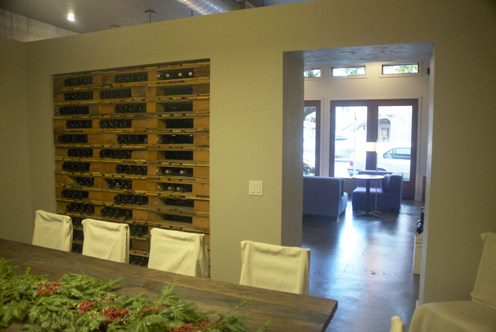 Our team gutted this space and started fresh, installing bifold atrium doors for an abundance of light. Custom tasting room counter tops, a wine pallet bottle storange shelf, and pops of luscious purple gives the space a truly unique and modern feel. Color design by Maria Flores.